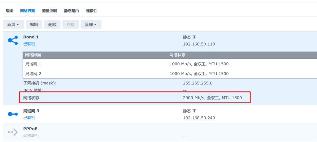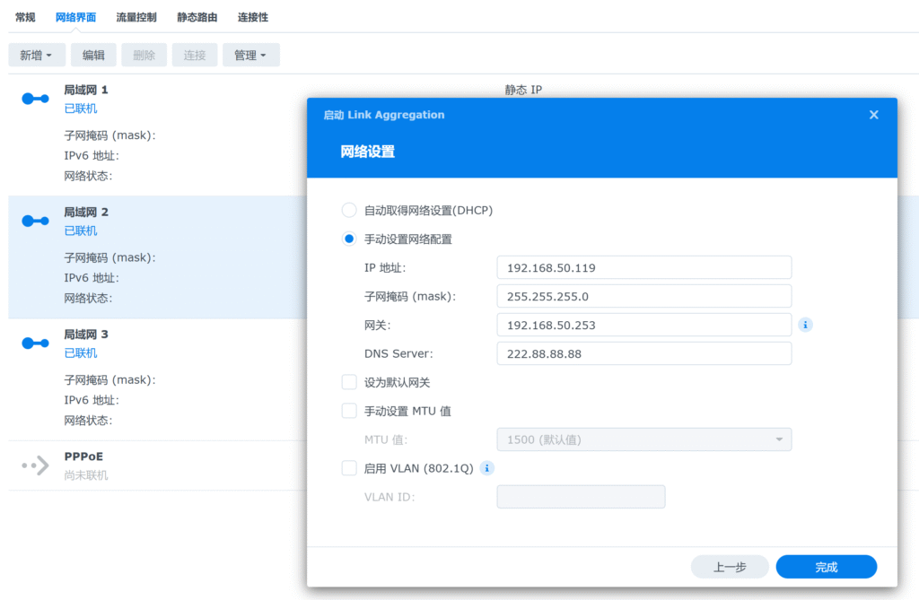 设置全新的IP地址–注意 交换机没有做LACP链路汇聚的情况下 群晖设置后会断网。设置的IP不要和网卡1、网卡2 IP地址重复。
